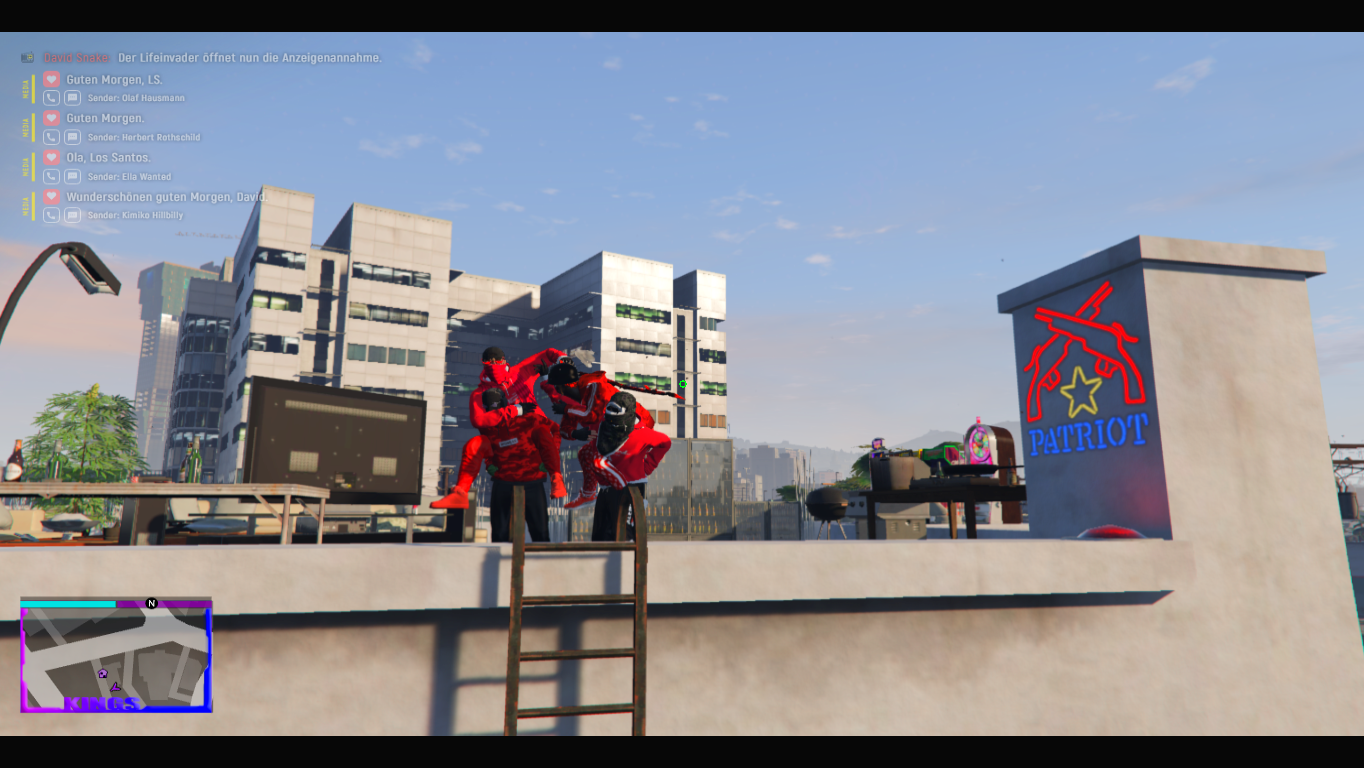 Auch würde ich ggf. sofern möglich mehr Interaktion mit den Staatlichen mit einbinden, sei es der LifeInvader oder auch die NG. Bzw, eine Berichterstattung über die Bloods oder mit der NG Events oder Fortrunden als Strafe für Fehlverhalten unserer Mitglieder.